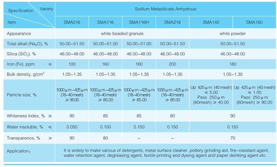 Standard compliance: HG/T 2568-2008《Industrial Sodium Metasilicate》,Enterprise Standard Q-PG/l-02-18-J《Industrial Sodium Metasilicate》